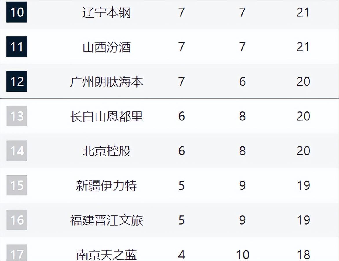 辽宁、山西、广州排在10-12。现在辽宁和山西都是两连败,排名持续下滑。辽宁是因为阵容实力下滑,进攻端很难有人站出来。山西则是因为潘江的执教问题,现在攻守全部出现问题。广州这轮输给天津,现在他们的战绩逐渐下跌了。