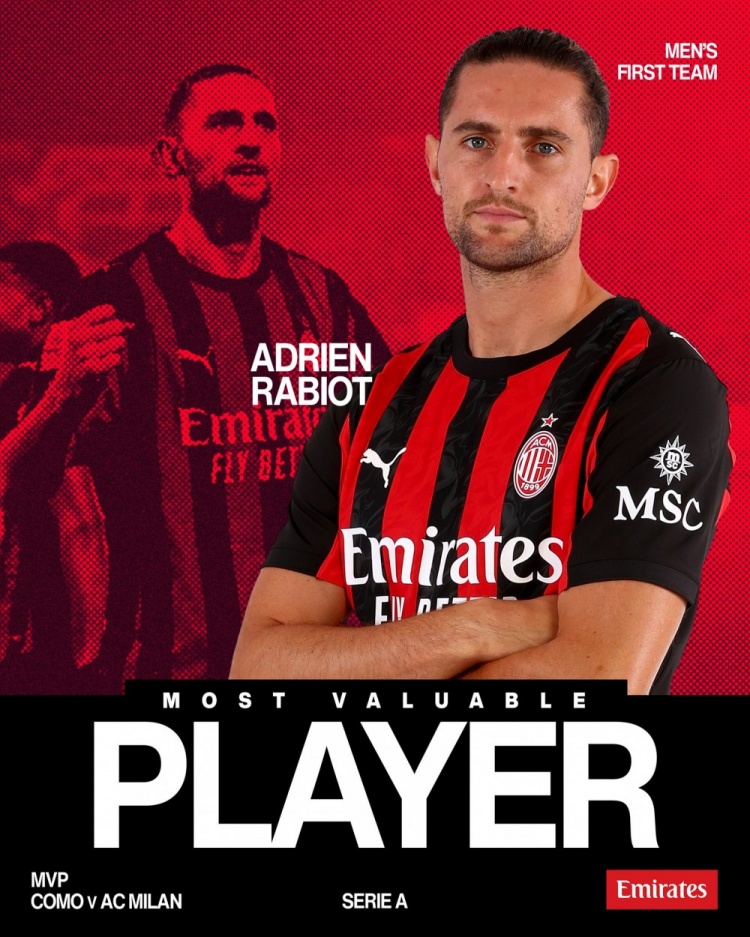 此役拉比奥特为米兰踢满全场,打进2球+造点,帮助米兰取胜,米兰官方宣布,他当选本场比赛米兰队内最佳球员。